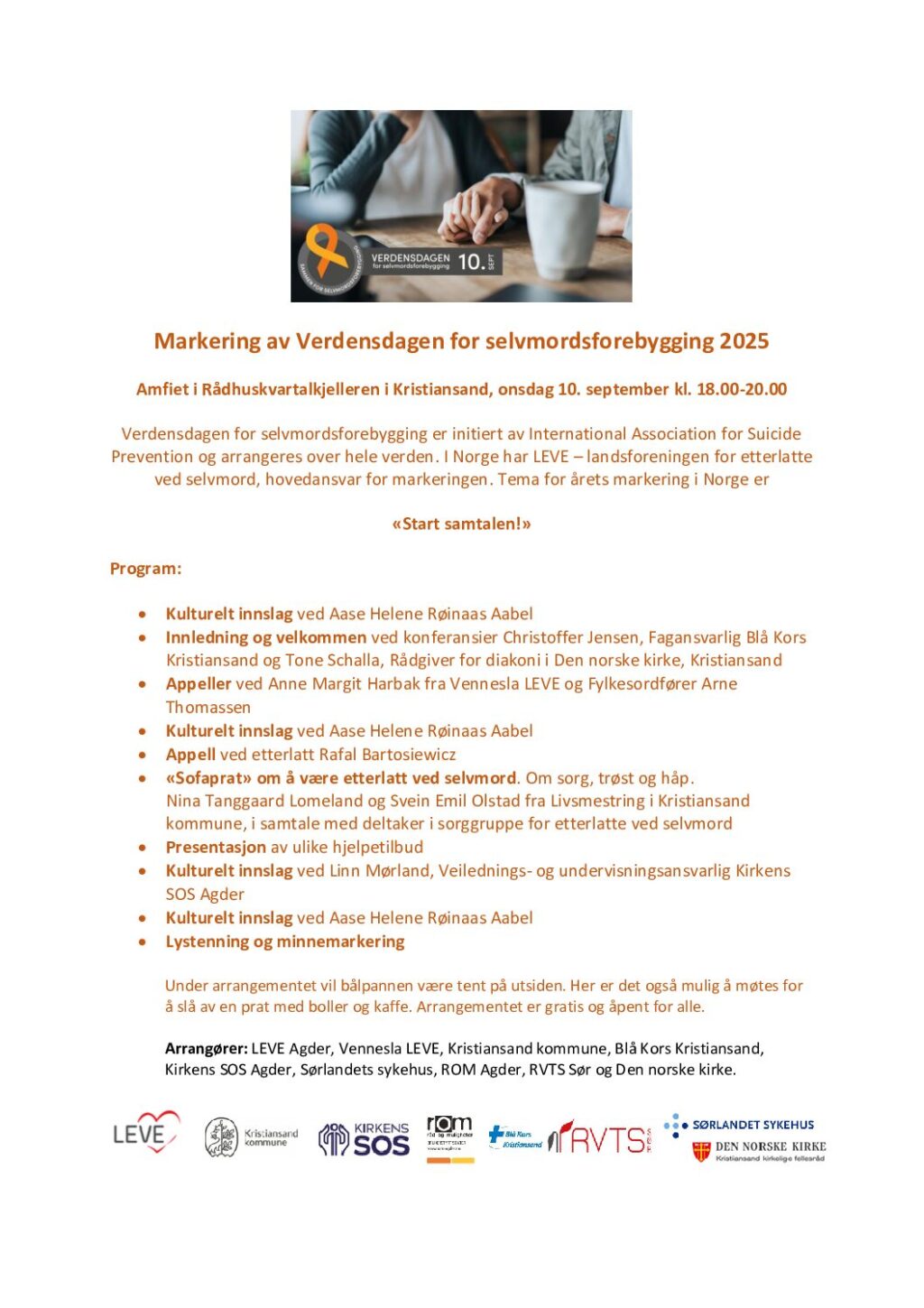 Arrangører: LEVE Agder, Vennesla LEVE, Kristiansand kommune, Blå Kors Kristiansand, Kirkens SOS Agder, Sørlandets sykehus, ROM Agder, RVTS Sør og Den norske kirke.